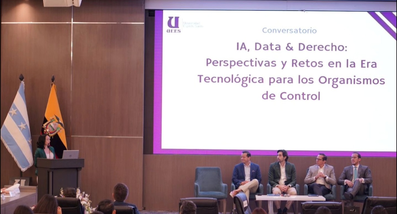 La Universidad de Especialidades Espíritu Santo (UEES) realizó, el 24 de octubre a las 18h00, el conversatorio “IA, Data & Derecho – Perspectivas y retos en la era tecnológica para los organismos de control”, en el Edificio P, Salón Fundacional. El panel reunió a tres ponentes alumni: Abg. Sebastián Vallejo Constantine (Máster en Derecho Digital), Abg. Carlos Puente (LL.M. en Law of Internet Technology and Automated Systems) y Abg. Ricardo Alvear Zenck, Registrador de la Propiedad de Guayaquil.